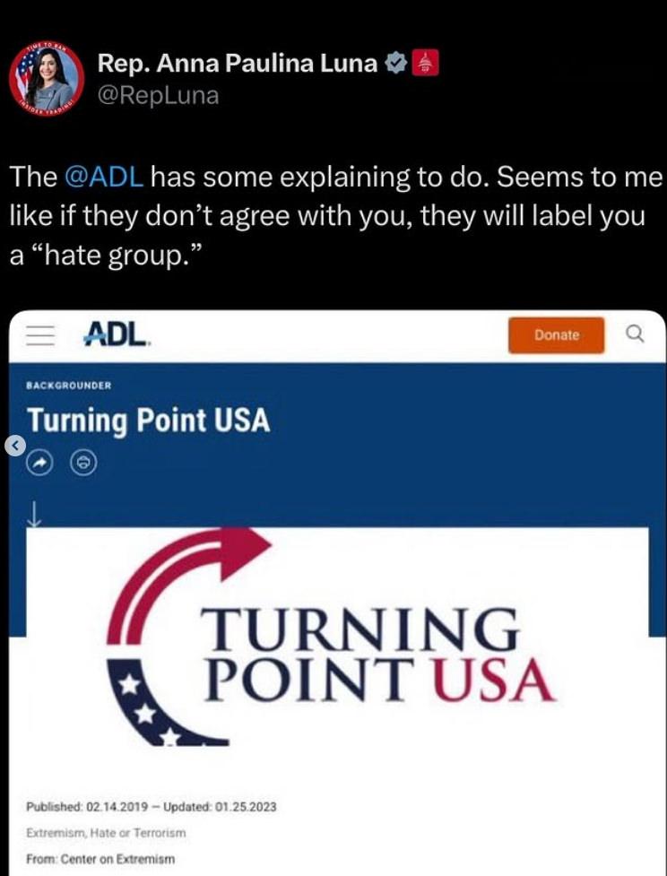 Cumhuriyetçi Kongre üyesi olan Anna Paulina Luna, ADL’nin tek taraflı hareket ettiğini belirterek, “Bana öyle geliyor ki, onlarla aynı fikirde değilseniz sizi hemen ‘nefret grubu’ olarak etiketliyorlar” ifadesini kullanmıştı.