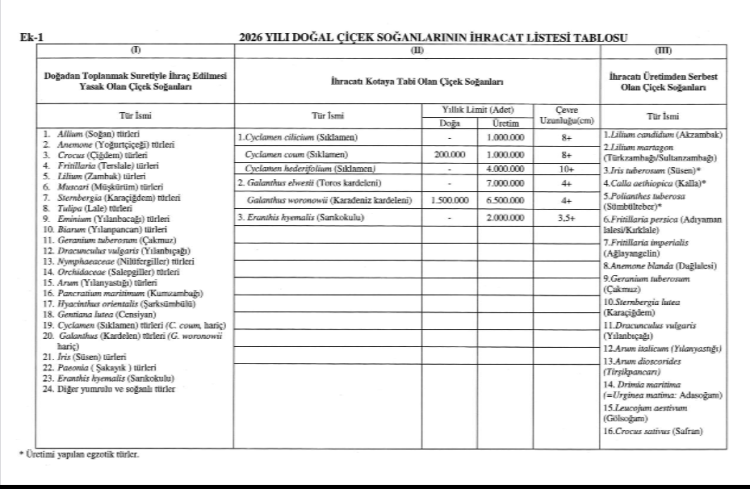 ANKARA (İGFA) – Tarım ve Orman Bakanlığı tarafından hazırlanan “Doğal Çiçek Soğanlarının 2026 Yılı İhracat Listesi Hakkında Tebliğ” Resmi Gazete’de yayımlanarak duyuruldu. Tebliğ, doğadan toplanması yasak olan türleri, kota uygulanacak türleri ve ihracatı üretimden serbest olan türleri belirleyerek, ihracat süreçlerine dair düzenlemeler içeriyor.